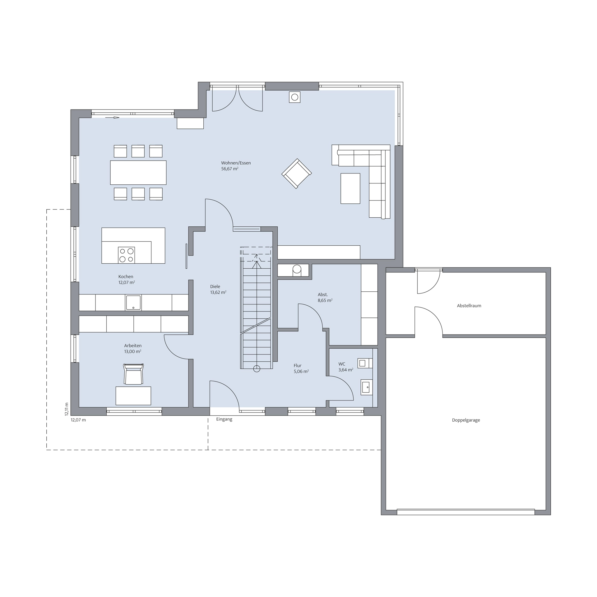 Das eindrucksvolle Haus Campmann verfügt über rund 240 m² Wohnfläche, ergänzt durch drei Stauräume im Kellergeschoss, wo sich außerdem der Technikraum, eine große Sauna und ein WC befinden. Knapp 69 m² und somit mehr als die Hälfte des Erdgeschosses nimmt der Wohn-/Essbereich mit offener Küche ein. Über eine Diele und einen Flur werden außerdem die anderen Räume des Erdgeschosses erreicht. Wie etwa das 13 m² große Arbeitszimmer, das abseits vom Trubel liegt und auch als weiteres Kinderzimmer, als Gästezimmer oder Hobbyraum dienen kann. Ein Abstellraum und ein Gäste-WC liegen ebenfalls im Eingangsbereich. Ein weiterer Abstellraum, etwa für Gartenutensilien, befindet sich direkt hinter der großen Doppelgarage. Im Obergeschoss stehen vier fast gleich große Schlafzimmer und zwei Bäder zur Verfügung. Das Elternschlafzimmer hat zudem ein eigenes Ankleidezimmer. Von der Galerie aus für alle zugänglich ist ein großer Balkon mit Gartenblick. Der Balkon dient im Erdgeschoss als Überdachung der Terrasse.
