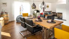 Haus Echterkamp ist ein optimal durchdachtes Familienhaus, in dem sich 146 m² Wohnfläche auf Erdgeschoss und Dachgeschoss verteilen und durch ein Kellergeschoss ergänzt werden. Zeitlos-modern erstrahlt die weiße Hausfassade, abgerundet durch eine Dacheindeckung, Fenster, Türen und das breite Garagentor im Anthrazitton. Der überdachte Balkon und die darunter liegende Terrasse sind ein optisches Highlight. Im Kellergeschoss befinden sich die Garage, ein Technikraum sowie zwei Kellerräume. Rund dreiviertel der fast 85 m² großen Wohnfläche im Erdgeschoss nimmt der helle, großzügige Wohn-/Essbereich mit offener Küche und Abstellraum ein. Im Außenbereich wird der Wohn-/Essbereich umrahmt von einem fast 22 m² großen Balkon, der sich aus dem vorgezogenen Teil der Garage ergibt, mit nahtlosem Übergang in die überdachte Terrasse mit Garten. Des Weiteren verfügt das Erdgeschoss über ein Duschbad mit Gäste-WC. Auf knapp 62 m² sind im Dachgeschoss die Privaträume verteilt. Über einen zentralen Flur gelangt man hier in die beiden jeweils rund 14 m² großen Kinderzimmer, das Familienbad mit Dusche und Badewanne sowie in das Elternschlafzimmer mit eigenem Ankleidebereich und überdachtem Balkon.