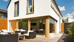 Modernste Architektur unter einem – oft in Gemeinden noch baurechtlich vorgeschriebenen – Satteldach: Das Haus der Familie Immel ist ein Stil-Juwel in durchdachter Fassung. Mit einer Dachneigung von 45 ° und einem Kniestock von 150 cm wird hier viel Raum in zeitgemäßer Optik geboten. Die Aluminiumleiste hat einen ähnlichen Effekt, wie ein freier, vor der Dachneigung stehender Giebel. Die großzügigen, jedoch gleichzeitig schlank anmutenden Glasflächen wirken verspielt und hochelegant zugleich – und verbinden im Gartenbereich das Puristische eng mit der Natur. Ein holzverschalter, kubischer Rahmen nimmt an der Traufseite den Eingangsbereich auf und rundet so den Zusammenfluss der Elemente ab.
