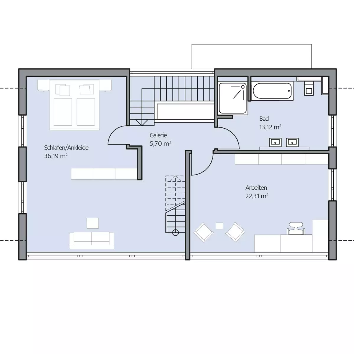 Die Wohnfläche von über 173 m² gibt sich kompromisslos modern und offen. Stilprägend sind die Sichtbeton-Oberflächen an Wänden, Böden und Decke, je nach Wohnraum ergänzt durch Glas, Putz, Fliesen und Sichtbalken. Zu diesem stimmig eingesetzten, neugierig machenden Materialmix kommen sichtbare Holzpfetten und Fensterrahmen aus unbehandeltem Lärchenholz. Im Erdgeschoss befinden sich die Diele, der Wohnbereich mit Essplatz und Küche sowie Nebenräume und Nischen. Im Obergeschoss finden ein Schlafzimmer mit Ankleide, Bad und Sitzgelegenheit sowie ein Kinder- oder Arbeitszimmer viel Platz.
